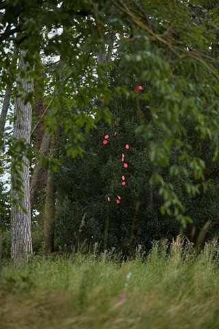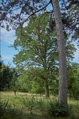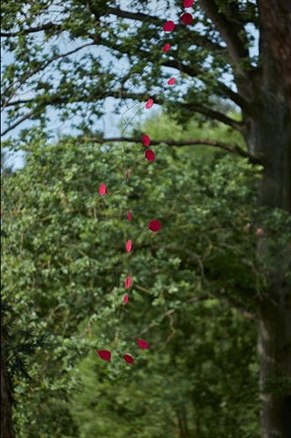 Between Heaven and Earth is a sculpture that mimics life through movement, using wind to animate its form as it dances in the green landscape of Hermannshof. Created in the summer semester of 2021 for a course on nature, the piece evolved under pandemic restrictions, with students initially meeting only online and uncertain if an exhibition would even occur. When they transitioned to in-person work, Between Heaven and Earth emerged as an expression of that shift—where digital planning gave way to physical reality. The piece embodies transformation, capturing the interplay between solitude and shared experience, art and nature.